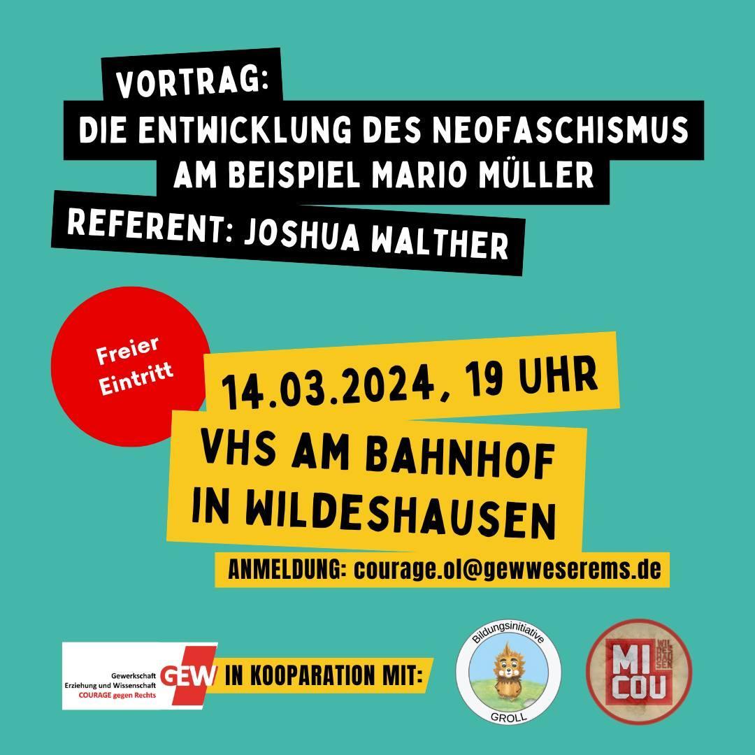 Am Donnerstag, den 14.03.2024, wird Joshua Walther vom Landesausausschuss COURAGE gegen Rechts der Gewerkschaft Erziehung und Wissenschaft (GEW) Niedersachsen um 19 Uhr über „Die Entwicklung des Neofaschismus am Beispiel Mario Müller“ in der VHS am Bahnhof in Wildeshausen, Raum 4, referieren. Der Vortrag wird in Kooperation mit dem Bündnis „Mit COURAGE gegen Rechts“ (MiCOU) Wildeshausen… Vortrag am 14.03.2024: „Die Entwicklung des Neofaschismus am Beispiel Mario Müller“ weiterlesen